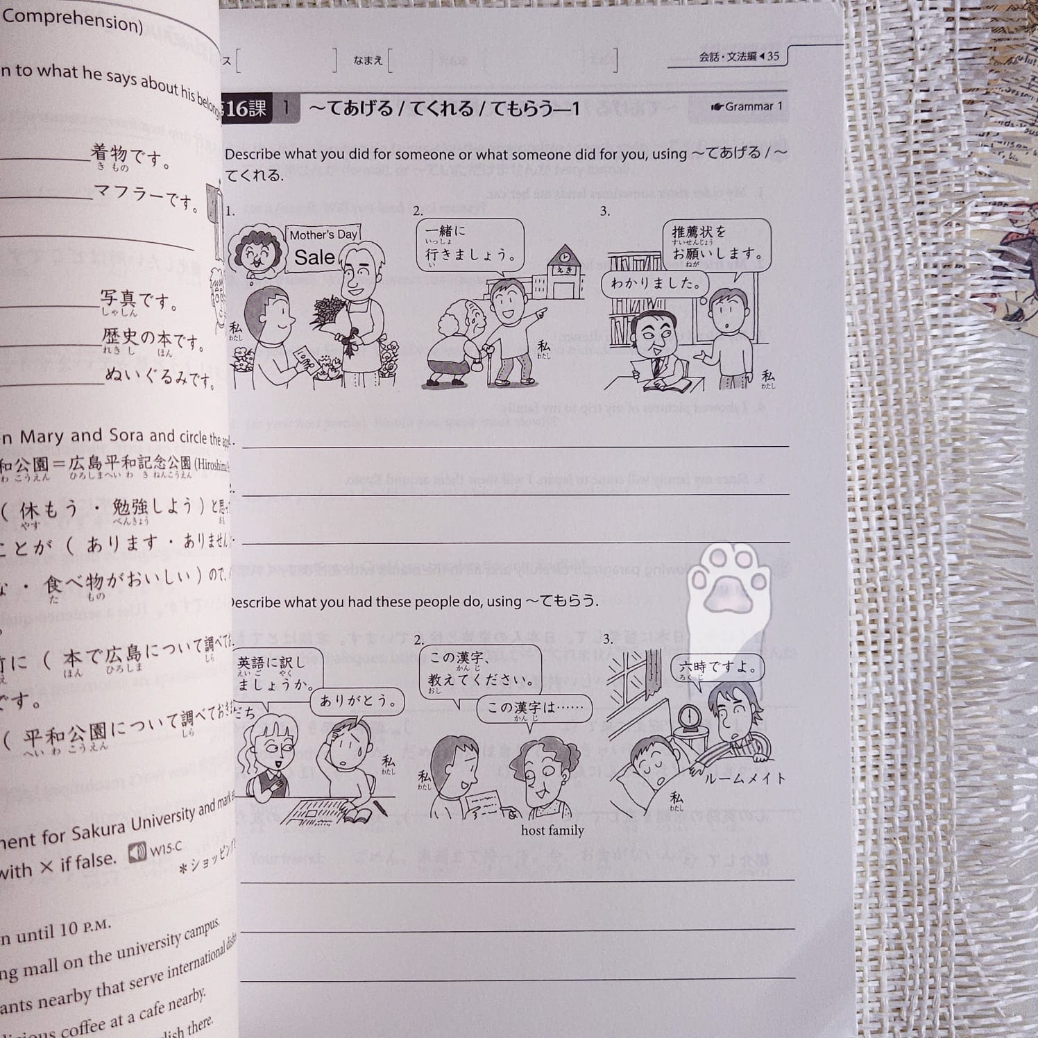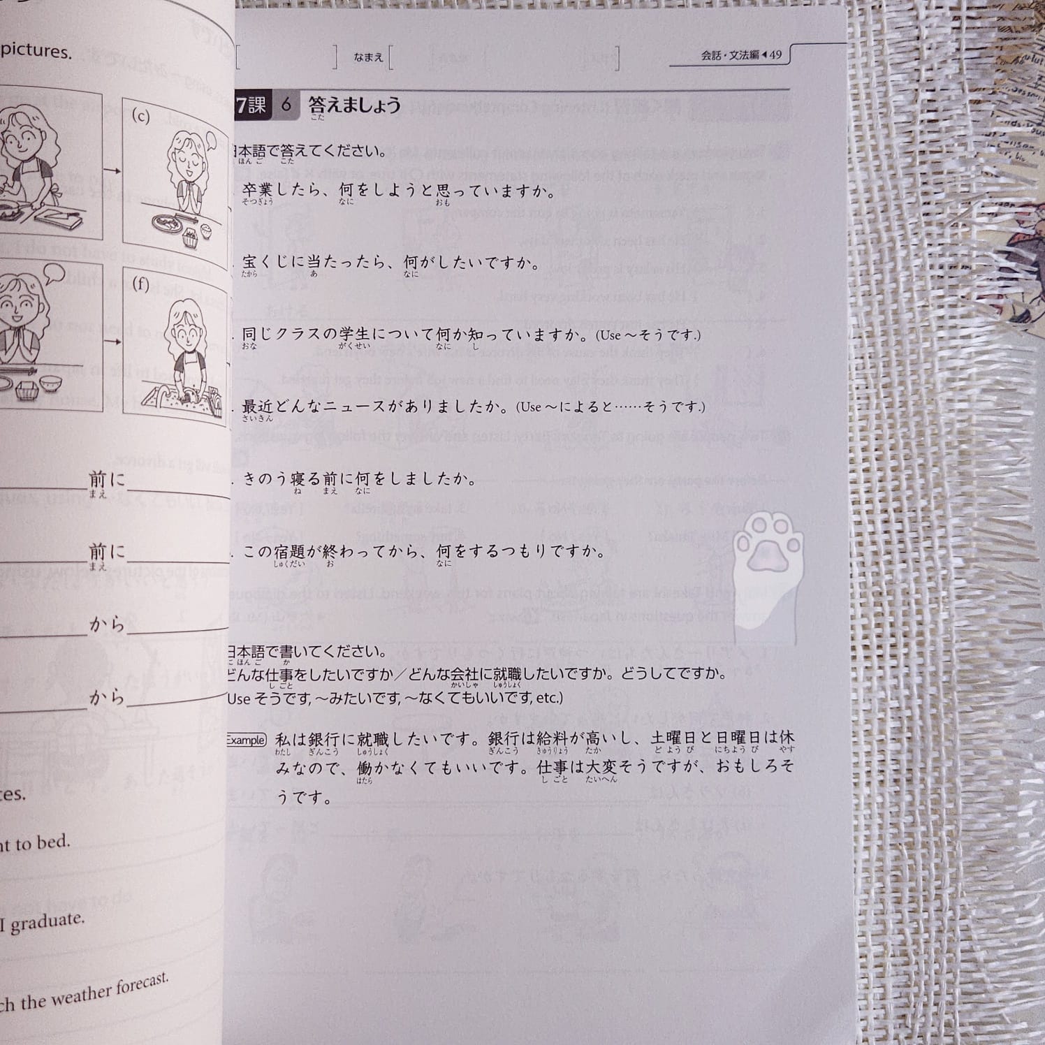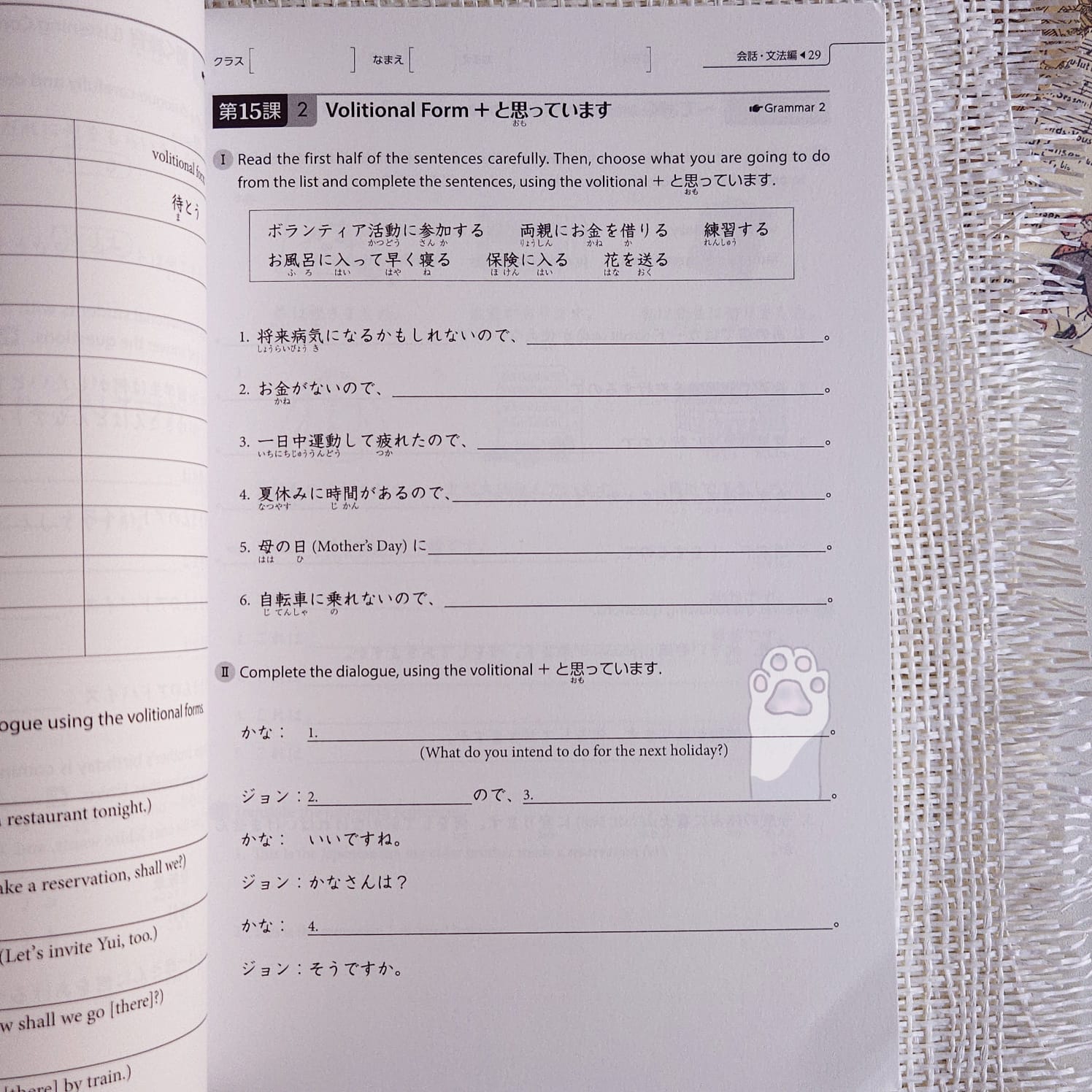 يحتوي هذا الكتاب على تمارين في القواعد والاستماع والكانجي، بالإضافة إلى قسم جديد للأسئلة. يتيح هذا القسم للطلاب صياغة إجاباتهم بحرية باستخدام ما تعلموه في الفصل. كما يتضمن الكتاب ملفات صوتية مصاحبة لأقسام فهم الاستماع